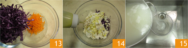 In a large bowl, pour in the carrots and cabbage 13 and the cauliflower, then dress with the citronette 14. Drain the rice, which should be cooked by now 15.