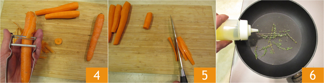 Now, peel the carrots with a vegetable peeler 4 and julienne them 5. In a pan, heat oil and thyme 6.