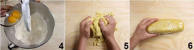 finally the two yolks plus the whole egg 4, keeping the egg whites aside. Let the ingredients blend together and then move the dough onto a work surface 5 and shape into a block, wrap it in plastic wrap, and leave it in the fridge for about an hour 6.