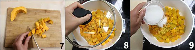 Now prepare the filling: wash the pumpkin, peel it, and cut it into pieces 7. Put it in a saucepan with water and let it simmer covered 7. When the pumpkin starts to break down, add the sugar and grated lemon zest 9. Let it cook until the pumpkin takes on a bright color (about 20 minutes) and becomes almost creamy.