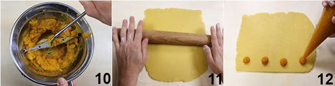 Pass the obtained mixture through a food mill 10 and set it aside in a bowl to cool. Roll out a strip of shortcrust pastry about 8 inches wide and 1/5 inch thick 11. Transfer the filling into a piping bag and fill your cookies, placing dollops of filling on the pastry 12.
