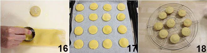 Form the cookies by cutting them with a 2-inch round cutter 16 and place them on a baking tray lined with parchment paper 17. Bake in a preheated oven at 350°F for 30 minutes and when the cookies are ready, let them cool on a wire rack 18.