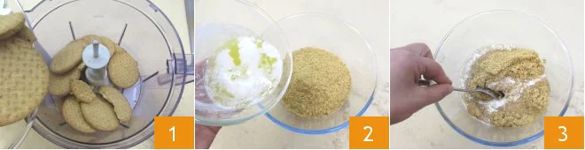 To prepare the yogurt cake with strawberry and berry jelly, start by placing the cookies in the mixer 1 and activating the blades to grind them into powder. Transfer the cookie powder to a bowl and add the butter, which you have melted in a saucepan 2. Mix well 3 to obtain a homogeneous mixture.