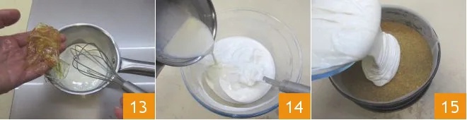 Heat the cream in a saucepan, and after the soaking time, squeeze the now-soft gelatin and add it to the hot cream 13, stirring until completely dissolved. Add the liquid to the yogurt cream mixture 14, mix thoroughly to incorporate it evenly, then remove the springform pan from the freezer and pour the mixture over the cookie base 15, smoothing it gently.