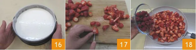 Refrigerate to set well for at least 2 hours 16. Meanwhile, prepare the jelly for the topping. Clean and wash the strawberries and cut them in half 17. Place them in a large pan along with the raspberries 18