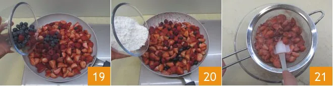 And the blueberries 19, and also add the powdered sugar 20. Stir and cook over low heat for at least 10 minutes, then strain the resulting puree through a sieve 21.