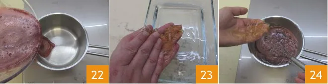 Transfer the puree to a saucepan 22, soak the gelatin in cold water for 10 minutes 23, squeeze it, and add it to the hot puree in the saucepan 34, stirring well to dissolve it completely.