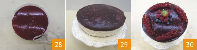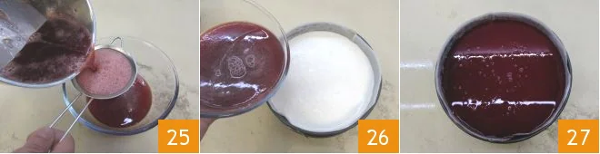 Strain the mixture 25 and let it cool slightly, then pour it into the cake pan over the layer of yogurt cream, which will have set by now 26. Smooth it well and transfer it to the fridge, where the cake should set for another 2 hours 27.