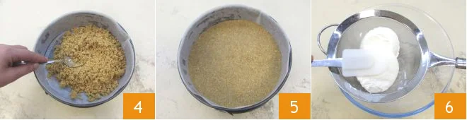 Line a 9-inch springform pan with parchment paper and spread the mixture on the bottom 4, pressing with the back of a spoon to create a compact and smooth base 5. Transfer to the freezer to set for at least half an hour so that the mixture solidifies. Meanwhile, attend to the cream: sieve the ricotta in a bowl 6 to remove the whey.