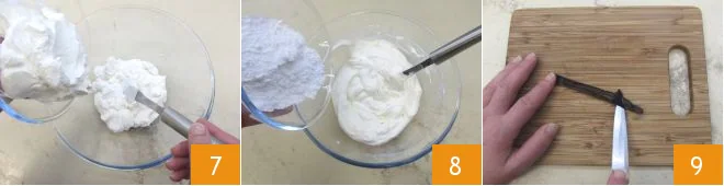 Add the Greek yogurt 7 and, with a spatula or a whisk, begin to mix. Add the powdered sugar 8, then take the vanilla bean, cut it lengthwise, and scrape the seeds with the tip of a knife 9.