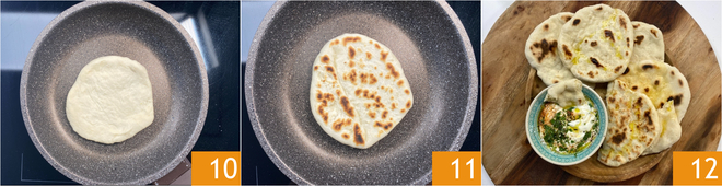 Cook the naans in a non-stick pan over high heat for about 3-4 minutes on the first side 10 and 2 minutes on the other side, or until golden brown 11. Serve your yogurt naan bread while still warm 12!