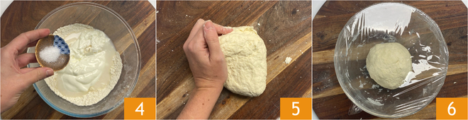 Add the salt 4 and mix everything with a spoon, then transfer the dough onto your work surface and knead by hand until you obtain a smooth and homogeneous dough 5. Let the dough rest in the bowl, covered with plastic wrap, for about an hour 6.