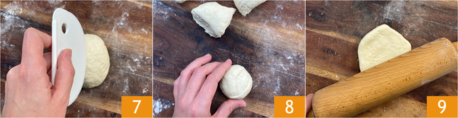 After this time, divide the dough into 6 portions 7, form balls 8, and roll them out with a rolling pin to form disks approximately 1/8 inch thick 9. If the dough tends to retract, let the disks rest for a couple of minutes and roll them out again, also using your hands.