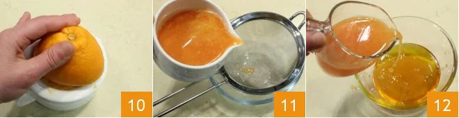 In the meantime, prepare the accompanying sauce: squeeze the juice of two oranges (about 2.2 oz) 10. Pass the juice through a strainer 11 and add it to the honey 12