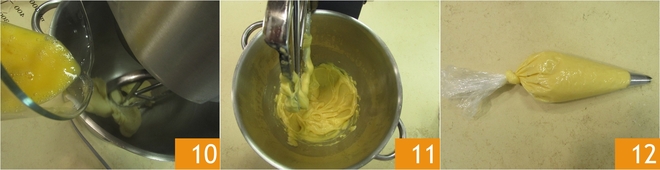 When the dough is no longer steaming, pour the eggs in slowly 10. This may take a few minutes, but we recommend doing this step slowly to get a good choux pastry. When you have a smooth and homogeneous mixture 11, turn off the mixer and use a spatula to transfer it into a piping bag with a 1/4 inch star nozzle 12. Refrigerate until needed.