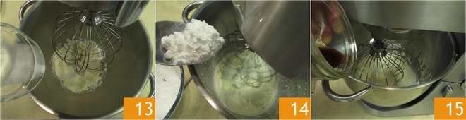 At this point, make the coffee and let it cool. When the coffee is cold, start preparing the Mascarpone cream. Pour the mascarpone into the mixer, turn on the whisk for a few seconds to soften it, then add the cream 13. Set the whisks to medium speed and add the powdered sugar gradually 14. When the cream is almost whipped, slowly pour in the coffee 15.