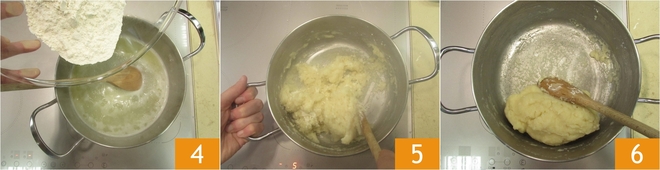 Then pour the flour all at once 4 and stir vigorously with a wooden spoon 5 to obtain a lump-free mixture. Cook until the dough detaches from the sides of the pan and a whitish film forms on the bottom 6.