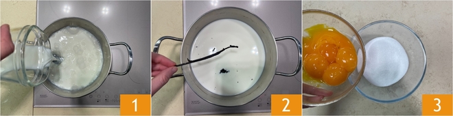 To prepare the zeppole with two creams, start by making the base of the pastry cream: heat the milk in a saucepan 1 and flavor it with the vanilla pod and the extracted seeds 2, let it come to a boil. Meanwhile, in a bowl, pour sugar and egg yolks 3.