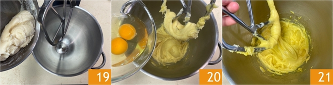 Pour the dough into the mixer 19. If you don't have one, you can use electric beaters, and while activating the paddle, pour one egg at a time 20. Work until the mixture becomes compact and soft 21.