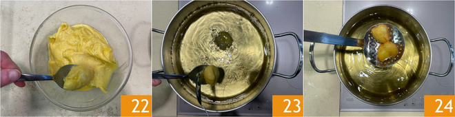 With a spoon dipped in hot oil, take a portion of dough 22 and pour it into the pot where you heated the oil to 320°F 23. This temperature will allow the zeppole to brown on the surface and cook internally in 4-5 minutes 34. Remember to cook a few pieces at a time.
