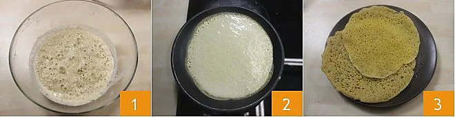 To prepare the zighinì, start with the injera bread, which requires two days to ferment: find the detailed recipe by clicking here (injera bread). Mix the three flours in a large bowl; dissolve the dry yeast in 250 ml of warm water (alternatively, you can use 6 g of fresh yeast) and pour the liquid in a stream over the flours. Mix vigorously with a whisk to obtain a thick, soft, and homogeneous batter that you will cover with plastic wrap and leave at room temperature for 2 days. After 2 days, add 150 ml of boiling water and baking soda to the mixture; mix with the whisk and cover everything again with the plastic wrap then let it rest for another hour, after which the mixture will appear swollen and full of bubbles 1. To cook the bread, you will need to use a round non-stick pan: heat it very well and pour about 70 grams of the mixture onto it. As soon as bubbles start to appear on the surface 2, cover with a lid and finish cooking: it will take about 2 minutes, you will notice that cooking is finished because the bread changes color 3. Once cooked, cover the bread very well with plastic wrap to prevent it from drying out.
