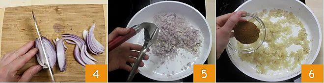 Now prepare the stew: slice and finely chop the onions 4 and place them in a pan with a drizzle of oil along with the crushed garlic cloves 5. Sauté everything over moderate heat, then add the berbere 6 and let it season for a few minutes.