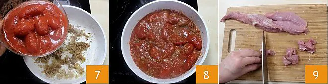 Add the peeled tomatoes 7, salt if necessary, and let it cook over low heat for about ten minutes 8. Meanwhile, cut the beef pulp 9 into pieces about 1 cm (try to cut them as evenly as possible to make cooking uniform).