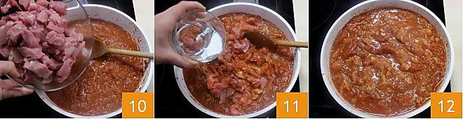 Add the meat to the sauce directly in the pan 10, mix, and let it cook with a lid for about 2 hours, stirring occasionally and adding warm water if the sauce becomes too dry 11. After two hours, the meat should be tender and the sauce thick but not dry 12; if this is not the case, add some water and cook for another 10-20 minutes. Towards the end of cooking, adjust the salt to taste.