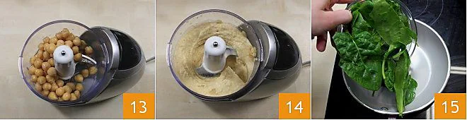 Prepare the accompaniment for the stew: blend the already cooked chickpeas in a mixer with a drizzle of oil, salt, and pepper to taste (13-14). Sauté the washed spinach with a drizzle of oil in a pan for a few minutes and salt them 15. You can leave the other legumes natural or season them with oil, parsley, salt, and pepper to taste. Wash the salad; wash and quarter the tomatoes.