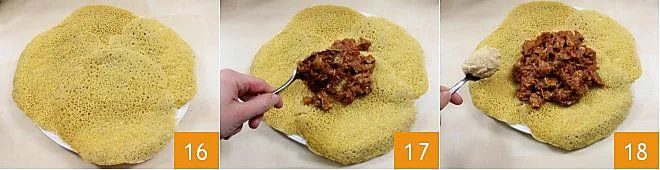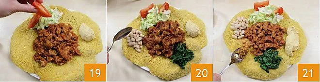 Once the meat is ready, you can assemble the zighinì: prepare a large plate (flat if possible) for every 3-4 diners, placing 3-4 injera stacked on top of each other 16, and place a couple of generous spoonfuls of stew in the center 17. Around the meat, arrange the vegetables and legumes: a spoonful of chickpea cream 18,