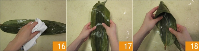 After the soaking time, rinse the bamboo leaves under running water, then clean them with a cloth on both sides to remove impurities 16. Slightly overlap 2 leaves 17, then fold them to form a kind of cone open on one side 18.