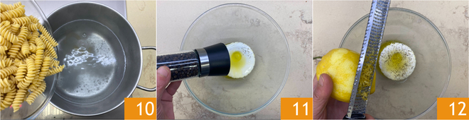 Drop the pasta into the boiling water 10. Meanwhile, in a bowl, place the ricotta, a drizzle of olive oil, and adjust with salt and pepper 11. Also add the lemon zest 12.