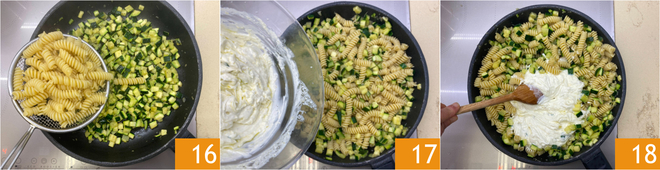 Drain the pasta one minute before the time indicated on the package and pour it into the pan 16, also add the ricotta cream 17 and stir to combine the ingredients 18.