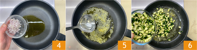 In a large pan, pour a drizzle of olive oil, add the shallot 4 and sauté over medium heat. Then add a ladle of water to prevent it from burning 5. Then add the zucchini 6.