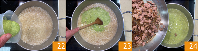 After about 10 minutes, add roughly two thirds of the zucchini cream 22 and stir to evenly coat the rice 23. Also incorporate the sautéed sausage 34 and finish cooking the risotto, which will take about another 5 minutes.