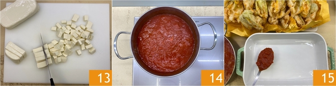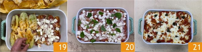Lay 1/3 of the well-compacted fried zucchini flowers 16. Cover with tomato sauce 17, mozzarella, a sprinkle of Parmigiano Reggiano 18, and a few torn basil leaves.