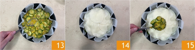 Pour half of the mixture into an 8-inch pan lined with parchment paper 13, arrange the slices of smoked provola on top 14 and add the remaining mixture 15.