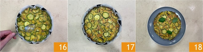 Level the surface with the back of a spoon 16 and bake in a preheated convection oven at 392°F for 35 minutes. When the frittata is nicely golden, remove it from the oven 17, transfer it to a plate and serve 18.