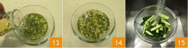 and the white wine vinegar 13; mix and set the marinade aside 14. After 30 minutes of draining the zucchini, rinse them under running water 15.