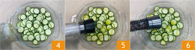 To prepare the zucchini omelette in the microwave, first thinly slice the zucchini into rounds about 1/8 inch thick 1 2. Transfer the zucchini to a 20 cm (about 8 inches) round baking dish suitable for microwave cooking 3.