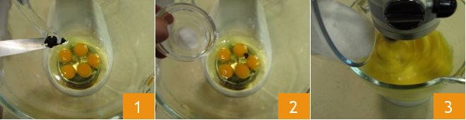 To prepare the zuccotto, first, make the sponge cake. Pour the eggs into the bowl of a stand mixer. Add the vanilla bean seeds 1 and a pinch of salt 2. Start whipping, and when the eggs become frothy, slowly add the sugar 3.