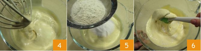 Meanwhile, butter and flour a 9-inch pan thoroughly, and as soon as the egg and sugar mixture becomes pale, swollen, and frothy 4, turn off the machine. Sift the flour and potato starch into it 5 and then gently fold with a spatula, making rotating movements from bottom to top 6.