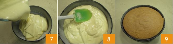 Pour everything into the pan 7 and use a spatula to level the surface 8. Bake the sponge cake in a preheated static oven at 320°F on the lowest shelf for about 50 minutes. Avoid opening the oven during this time, and before removing the cake, always check the cooking with a toothpick test, as each oven bakes differently. In fact, inserting the toothpick in the center of the cake, it should come out completely dry. Once cooked, remove the sponge cake from the oven 9.