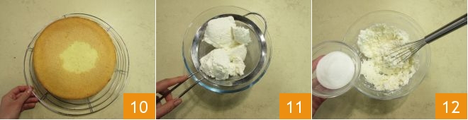 Wait a few minutes, then unmold it by turning it upside down and let it cool completely on a wire rack 10. At this point, sift the ricotta into a bowl 11, then add the sugar 12.