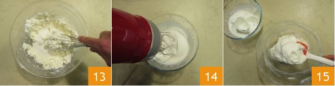 and mix with a whisk 13. Separately whip the cream 14 and gently fold it into the ricotta mixture, mixing from bottom to top so as not to deflate it 15.