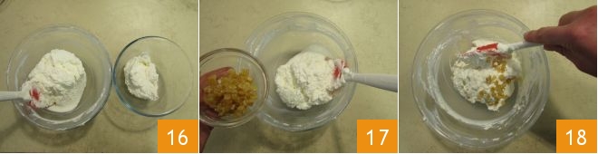 At this point, transfer about 1/3 of the mixture, or about 7 oz, into another bowl 16. Then add the candied orange cubes to the bowl containing more filling 17 and fold them into the rest, mixing with the spatula 18. Place in a piping bag.