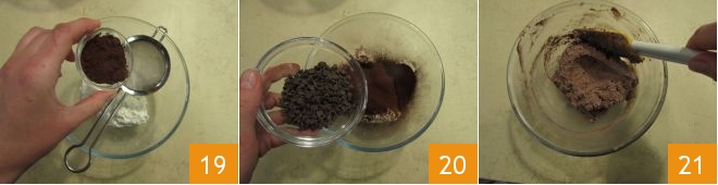 Instead, sift the cocoa powder into the bowl with less filling 19 and add the chocolate chips 20. Mix everything 21 and place it in another piping bag.