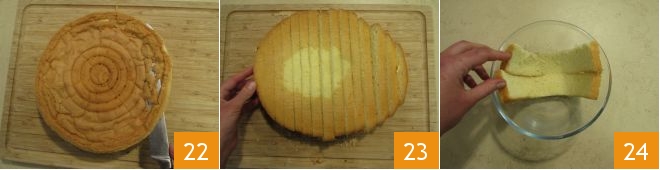 When the sponge cake is cooled, remove the top crust 22, then turn it upside down and cut it into slices about 0.4 inches thick 23. At this point, get a zuccotto mold, or a glass bowl, 6.7 inches in diameter and 4.3 inches in height. Arrange the freshly cut slices inside, making them adhere well to the edges 34.