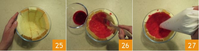 and fully line the bowl 25. At this point, using a brush, lightly soak the inside with alchermes 26. Pour the white cream inside, ensuring to leave a hollow in the center 27,