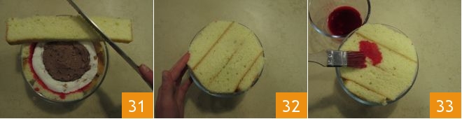 All that's left is to seal the zuccotto. Place the sponge cake slices on top and trim the excess with a knife 31. Gradually place the slices to entirely cover the base 32. Then, using the brush, soak the base as well.
